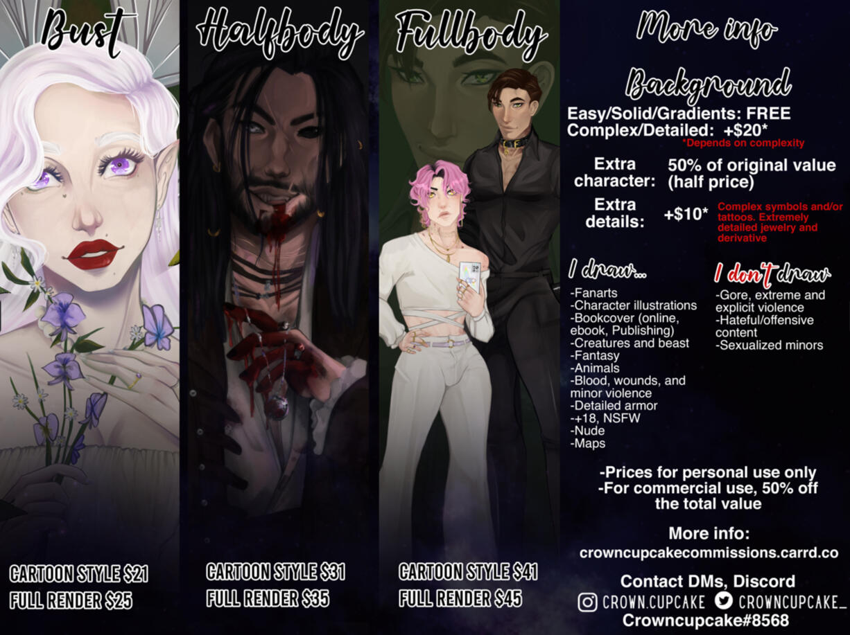 ¿QUÉ PUEDE INCREMENTAR EL PRECIO BASE?-Todos los dibujos tienen un fondo sencillo, que puede ser un color sólido, un gradiente, un patrón, o un escenario básico difuminado. Fondos DETALLADOS y específicos, como escenarios, habitaciones, etc., tendrán un costo extra a partir de los 20USD que será discutido.-DETALLES EXTRAS ESPECIFICOS, como: mucha joyería detallada, gran cantidad de partes mecánicas, patrones y/o tatuajes con diseños complicados, etc. Tendrán un costo extra a partir de los 10USD que será discutido.