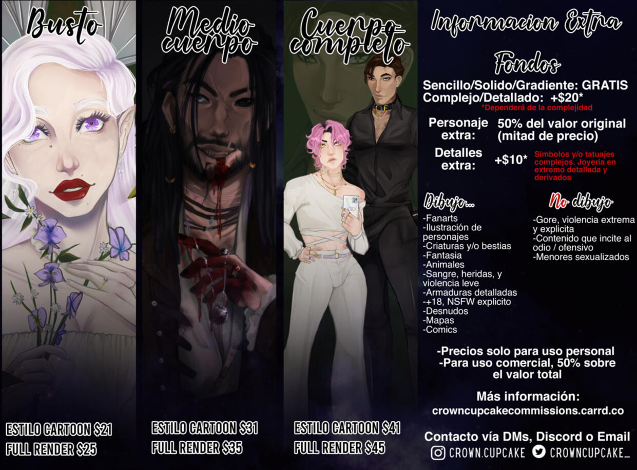 -Por cada personaje extra, éste tendrá un 50% de descuento del precio inicial. (Si es un cuerpo completo de $45, cada personaje extra serán $25, por ejemplo)